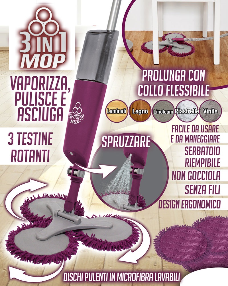 3 in 1 Mop ti permette di vaporizzare, pulire ed asciugare, senza dover più ricorrere ad un sistema specifico per ognuna di queste attività. Inoltre è leggero, facile da utilizzare e maneggiare, senza fili e dal design ergonomico. Per ricevere il prodotto a casa, compilate il modulo di acquisto e potrete pagarlo direttamente alla consegna.